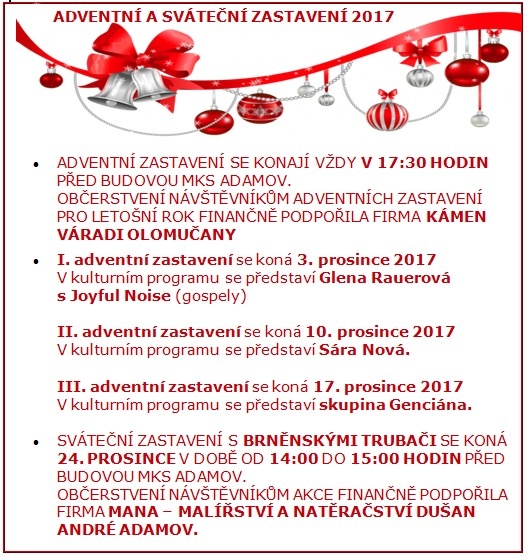II. adventní zastavení se koná 10. prosince 2017. V kulturním programu se představí zpěvačka Sára Nová.