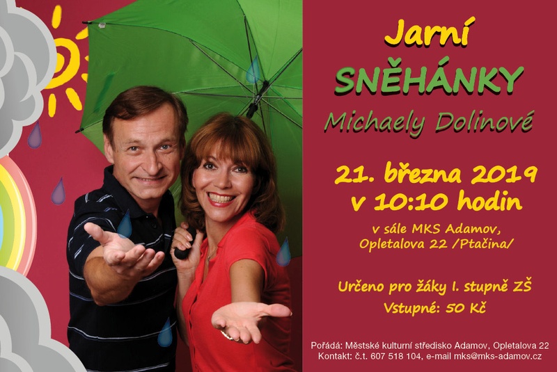 Pro děti (od cca 6ti do 12ti roků) jsme připravili představení Michaely Dolinové Jarní sněhánky. Těšit se na ně děti mohou 21. března 2019 v 10:10 hodin (v sále MKS na Ptačině). Vstupné: 50 Kč