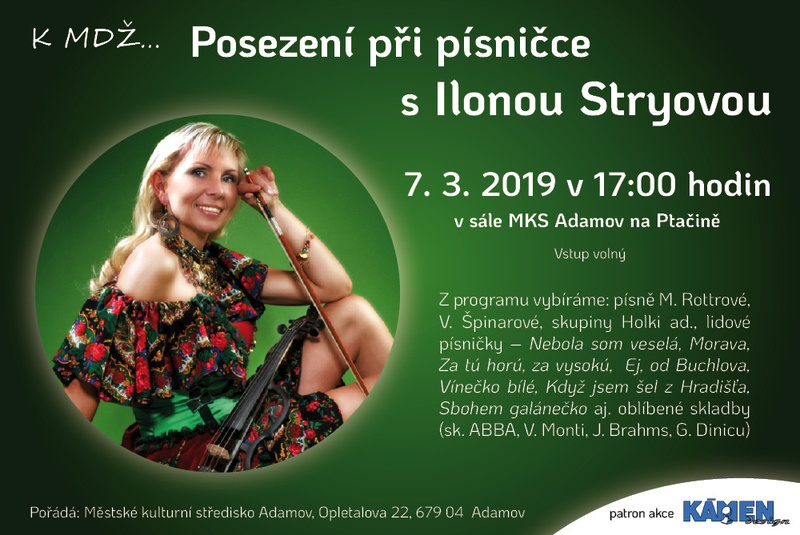 V předvečer svátku MDŽ přijměte pozvání na setkání s Ilonou Stryovou - houslistkou a zpěvačkou a zaposlouchejte se, nebo si i spolu s ní zazpívejte známé populární i lidové písně.