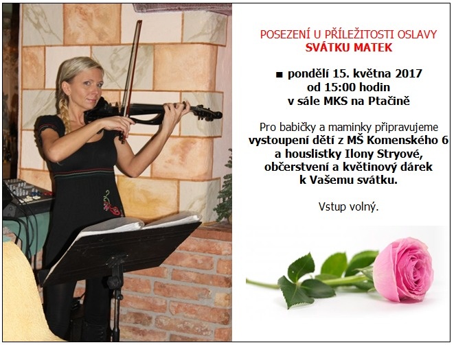 U příležitosti Svátku matek zveme všechny maminky a babičky dne 15. května 2017 k příjemnému posezení v MKS, kde pro vás vystoupí děti z MŠ Komenského a houslistka Ilona Stryová. Začátek setkání je v 15 hodin.