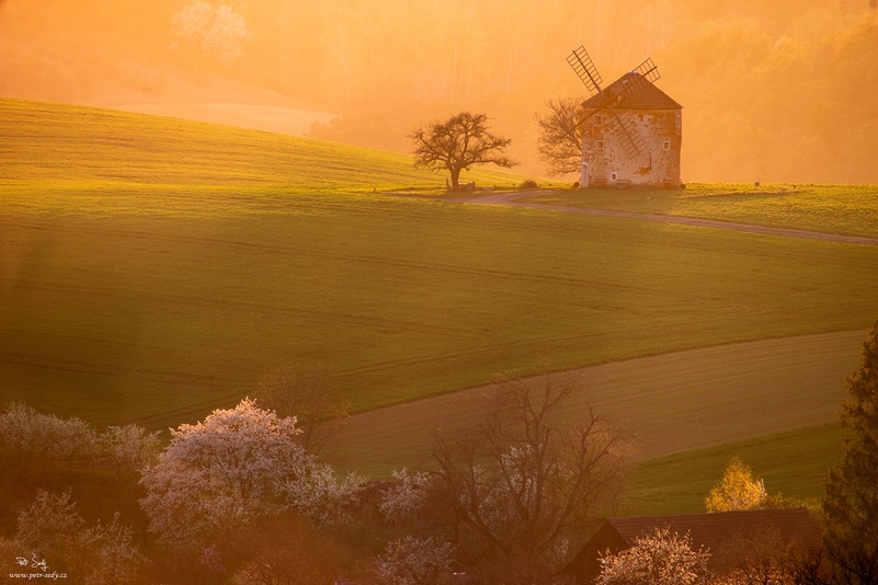 Fotka větrného mlýna v Kunkovicích při západu slunce.