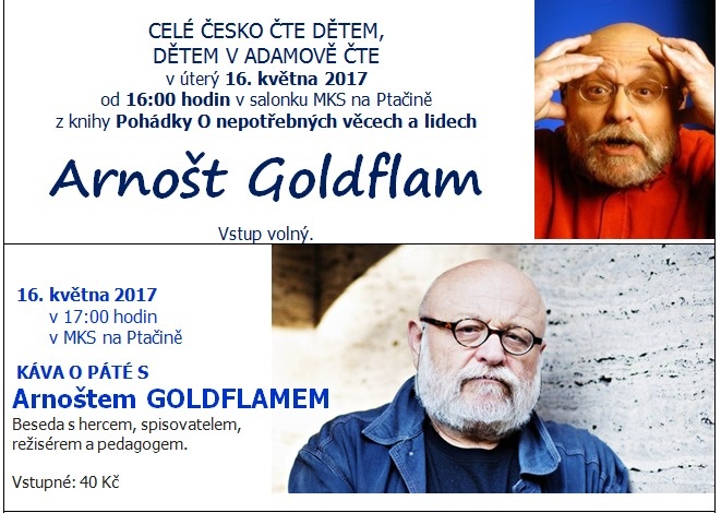 16. května 2017 do Adamova zavítá další vzácný host, pozvání tentokrát přijal herec, spisovatel, režisér a pedagog Arnošt Goldflam. V 16 hodin v rámci akce Celé Česko čte dětem přečte dětem z knihy Pohádky O nepotřebných věcech a lidech. V 17 hodin si pak "s dospěláky vypije Kávu o páté..."