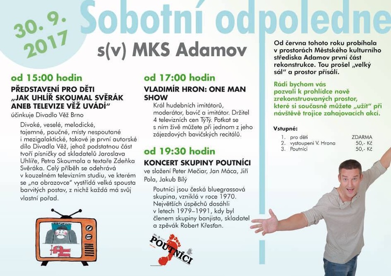 Od června tohoto roku probíhala v prostorách Městského kulturního střediska Adamov první část rekonstrukce. Tou prošel velký sál a prostor přísálí. Rádi bychom vás pozvali k prohlídce nově zrekostruovaných prostor, které si můžete "užít" při návštěvě trojice zahajovacích akcí 30. 9. 2017.