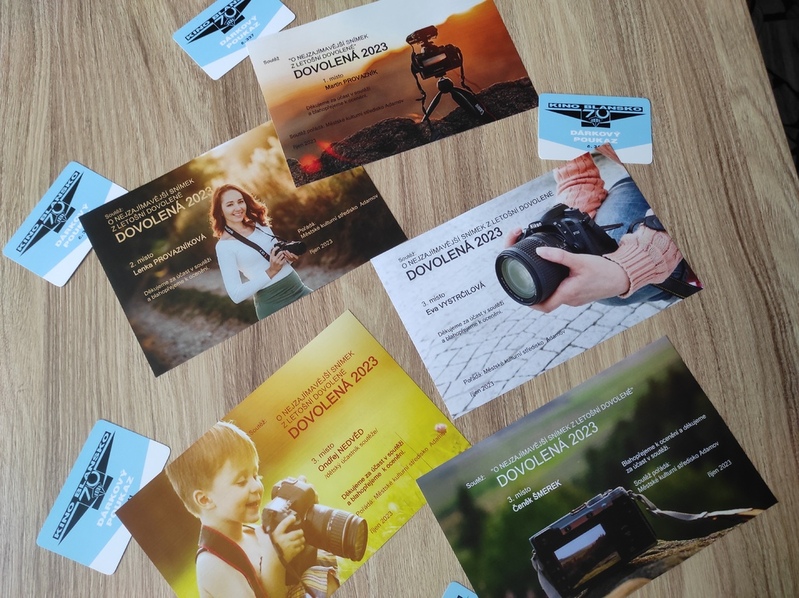 Dvacítka fotogafrií, které v letošním roce přihlásili jejich autoři do soutěže "o nejzajímavější snímek z letošní dovolené", byla vystavena do 20. října v přísálí MKS. Návštěvníci akcí se tak mohli zapojit do hodnocení a vybrat fotogafie, které pro ně byly těmi "nej". Hodnocení probíhalo fomou přidělování tří, dvou nebo jednoho bodu příslušným fotogafiím. Následovalo sčítání bodů, a to rozhodlo o vítězích soutěže. 1. místo obsadil Martin Provazník 2. místo patří Lence Provazníkové 3. místo obsadili se stejným počtem bodů Čeněk Šmerek, Ondřej Nedvěd, Eva Vystrčilová. Na všechny čeká poukázka do kina Blansko. Děkujeme za účast v soutěži a přejeme příjemný kulturní zážitek. Foto: První výherce si vyzvedl svoji odměnu.