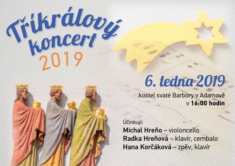 Tradičně se i v roce 2019 připojí MKS Adamov k pořadatelům Tříkrálových koncertů. 6. ledna vás pozveme do kostela sv. Barbory, kde v rámci akce vystoupí manželé Hreňovi a Hana Korčáková. Začátek v 16 hodin, vstupné - příspěvek na Tříkrálovou sbírku.