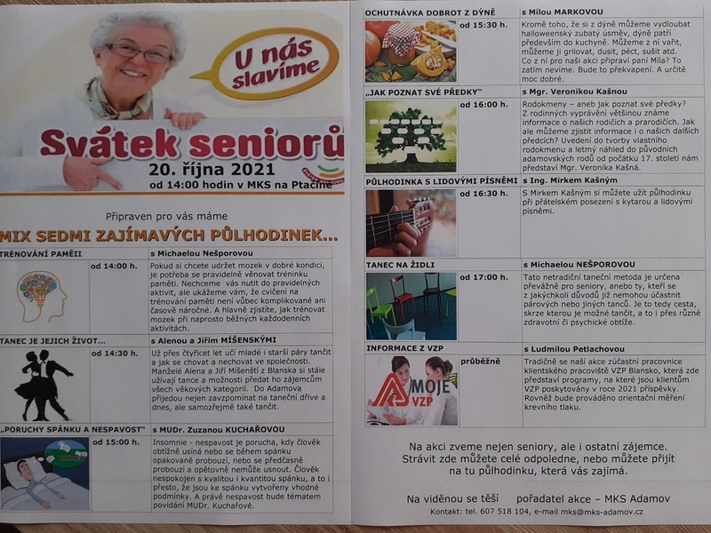 Ačkoliv si Svátek seniorů připomínáme 1. října, my vás pozveme ke společné oslavě až 20. října 2021, kdy jsme pro vás v době od 14:00 do 17:30 hodin připravili "mix půlhodinek se zajímavými lidmi". A zde máte upřesnění našeho pozvání: