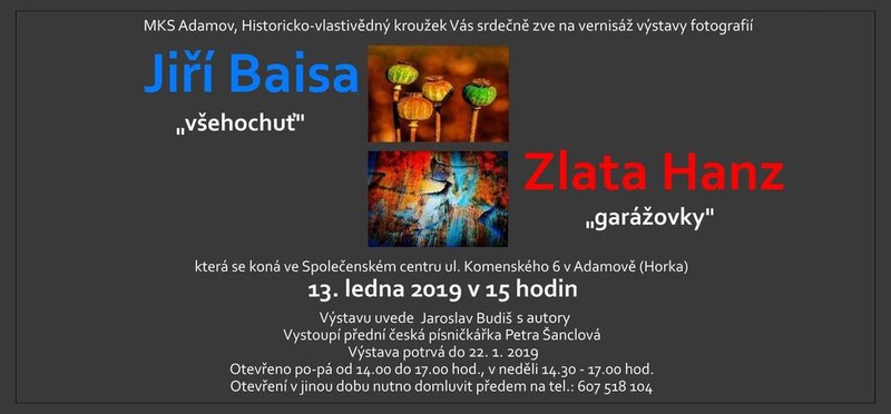 Srdečně vás zveme na vernisáž výstavy, kde vám svoje práce představí Jiří Baisa a Zlata Hanz. Vernisáž: 13. ledna 2019 v 15:00 hodin ve výstavní síni MKS na Komenského 6 /Horka/ Výstava potrvá do 22. ledna t.r. Výstava je pro veřejnost otevřena: v pracovních dnech od 14:00 do 17:00 hodin, v neděli od 14:30 do 17:00 hodin. V ostatním čase po domluvě předem na č.t. 607 518 104