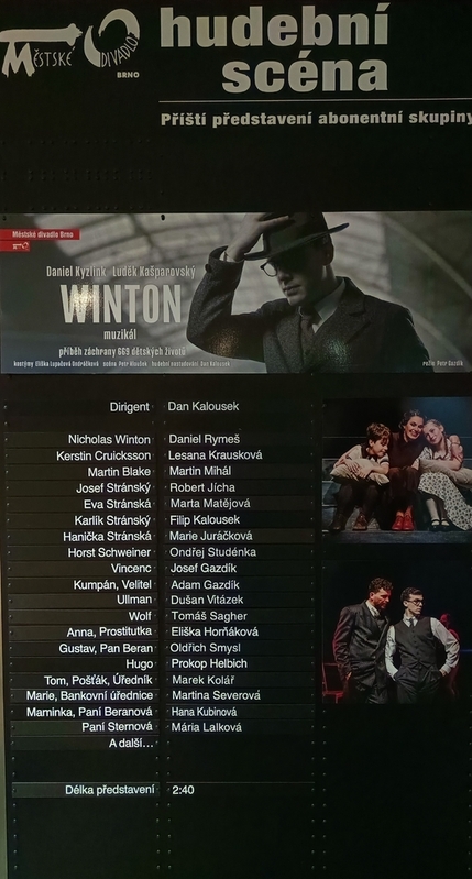 Jméno Nicholas Winton je spojeno se záchranou 669 především židovských dětí. V MDB byl tento příběh uveden v podobě muzíkalu před několika málo dny ve světové premiéře v režii Petra Gazdíka. My jsme v roli N. Wintona viděli skvělého Daniela Rymeše. V dalších rolích se představili Robert Jícha, Marta Matějová, Martin Mihál, sourozenci Gazdíkovi. Dětských rolí se skvěle zhostily děti z muzikálové školy při MDB. 31/10/2025